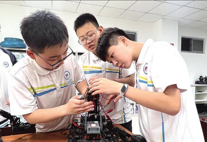延安市新区第一中学学生在人工智能社团活动室修理模型