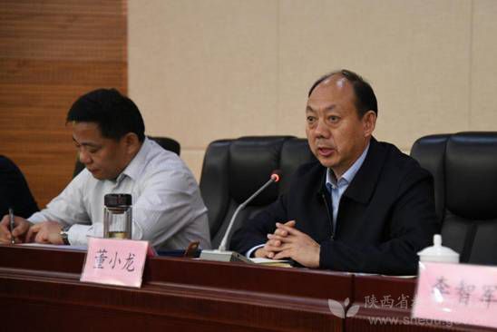 陕西省委高教工委书记董小龙(右)在全省高校“双百工程”暨特色产业扶贫工作会议上讲话